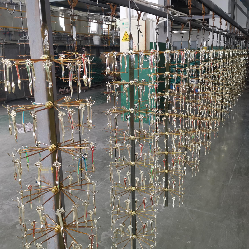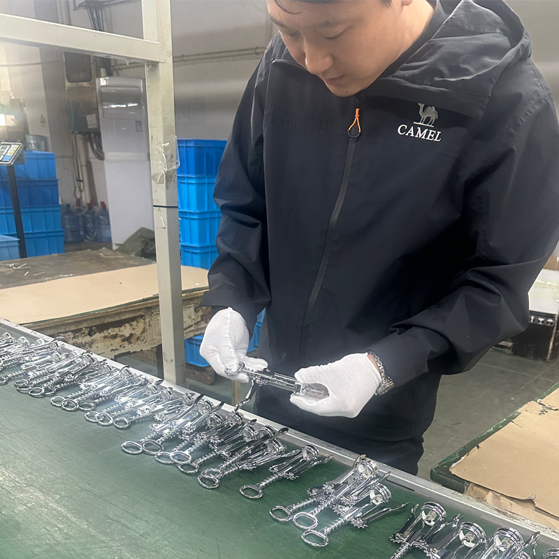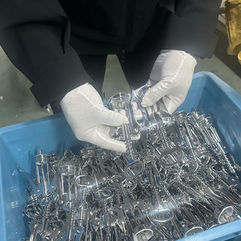 De coatings op alle componenten van de kurkentrekker maken doorgaans gebruik van galvanische of verfmethoden. Voor deze illustratie zullen we ons concentreren op galvaniseren. De galvanische verwerking wordt voltooid door een uitbestede leverancier, waarvoor zeer gespecialiseerde faciliteiten, apparatuur en industriële ingenieurs nodig zijn met jarenlange ervaring in hun vakgebied, samen met talrijke basistechnici en ervaren werknemers. Het is een zeer complex proces. We onderhouden een langdurige samenwerking met leveranciers die 30 jaar ervaring in de industrie hebben, waardoor de productstabiliteit wordt gegarandeerd. Dit zorgt er ook voor dat verschillende productieproblemen die zich tijdens de productie voordoen, snel, professioneel en efficiënt kunnen worden aangepakt. Deze regelingen helpen de productiecycli voor artikelen zoals wijnaccessoires, keukengerei en kurkentrekkers te garanderen, terwijl ze ook de verkoopplannen van klanten ondersteunen.