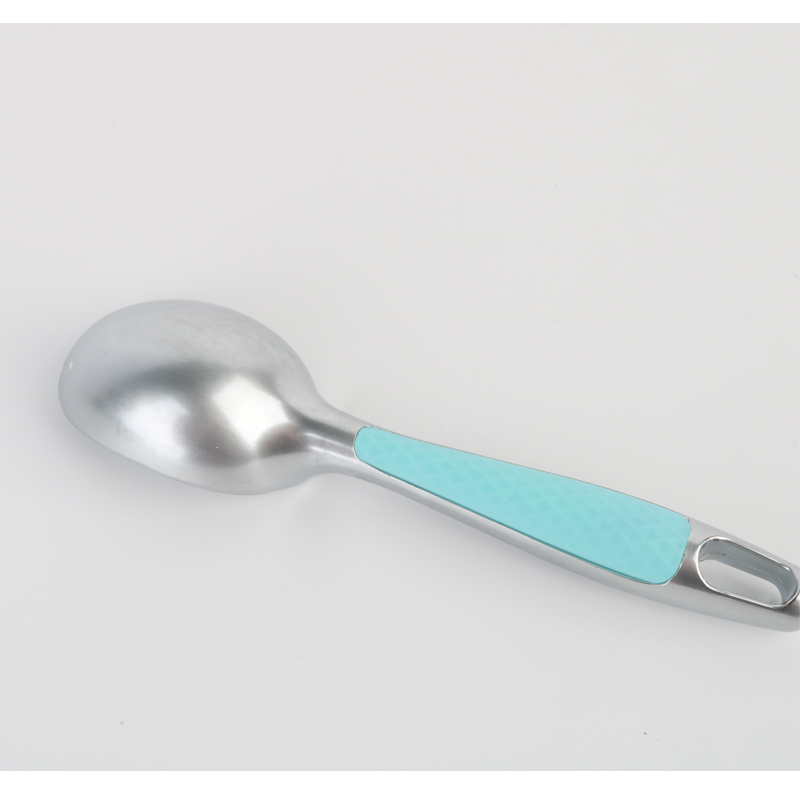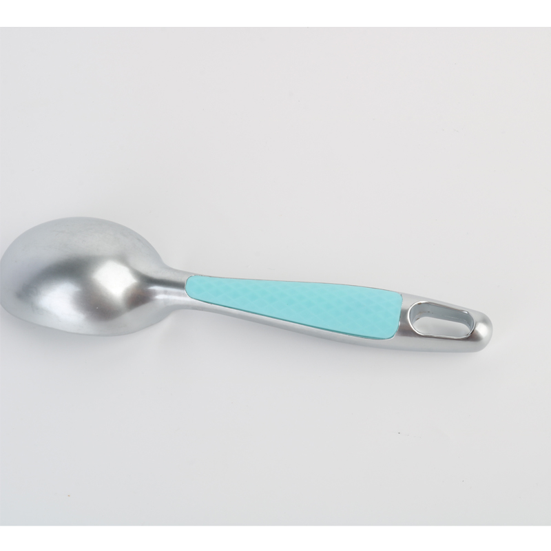 De professionele ijsschep van zinklegering met comfortabele grip, vaatwasmachinebestendig, uniek gedempt, antislip plastic handvat bevindt zich aan de achterkant van het product, speciaal ontworpen voor optimale grip bij gebruik van de omgekeerde viervingergreep. Zoals te zien is in de productillustraties, bevat het handvat een gestructureerd oppervlaktepatroon dat zorgt voor een veilige bediening en tegelijkertijd handvermoeidheid vermindert. Dit doordachte ontwerp verbetert niet alleen de gebruikerservaring, maar toont ook onze inzet om functionaliteit te combineren met elegant vakmanschap in elk detail.